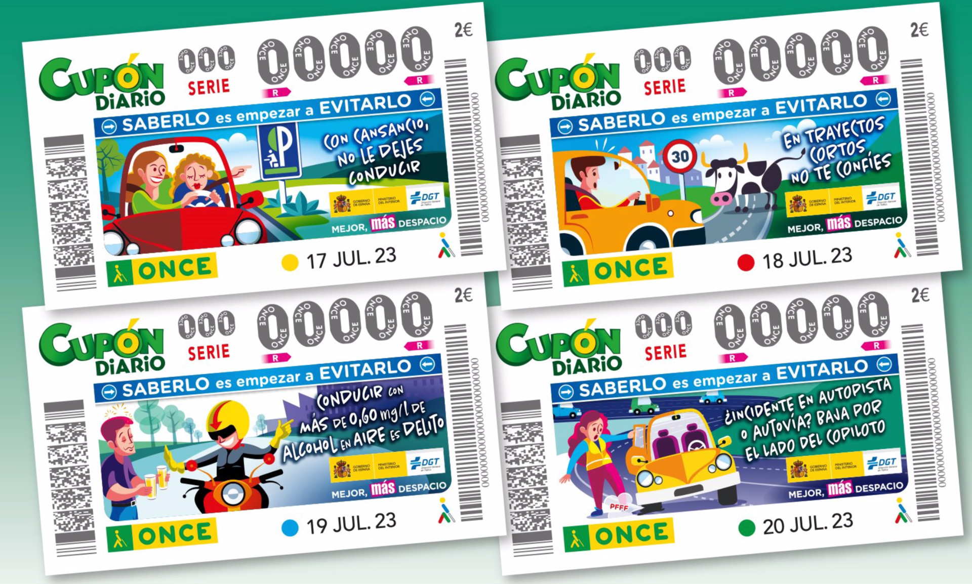El primer cupón, correspondiente al lunes 17 de julio, se centra en el peligro que supone llevar el volante en condiciones físicas poco adecuadas. Por ello, incluye la frase 'Con cansancio no le dejes conducir' para concienciar sobre la importancia de no permitir que alguien se ponga a los mandos de un vehículo en caso de que su estado físico no sea el idóneo.