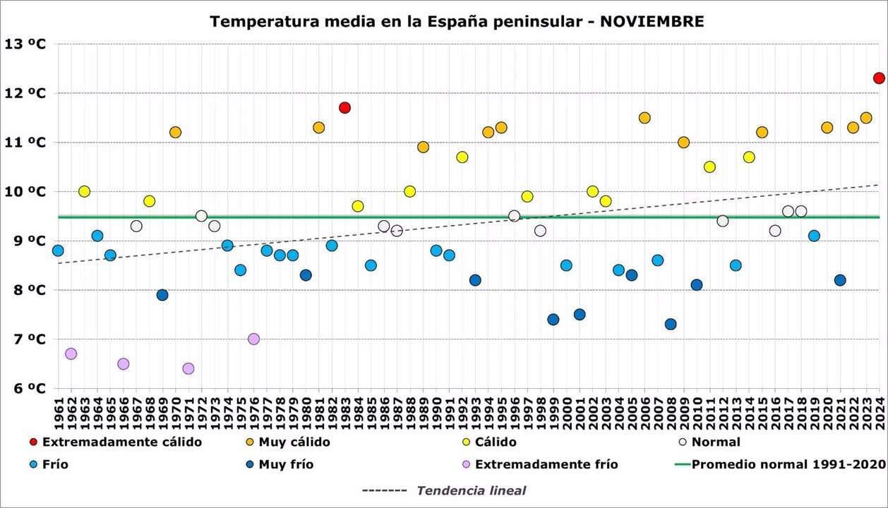 El pasado noviembre fue el más cálido en la Península desde que hay registros, según la Agencia Estatal de Meteorología (AEMET), cuya serie histórica comienza en 1961. Además, fue un noviembre muy seco en su conjunto.