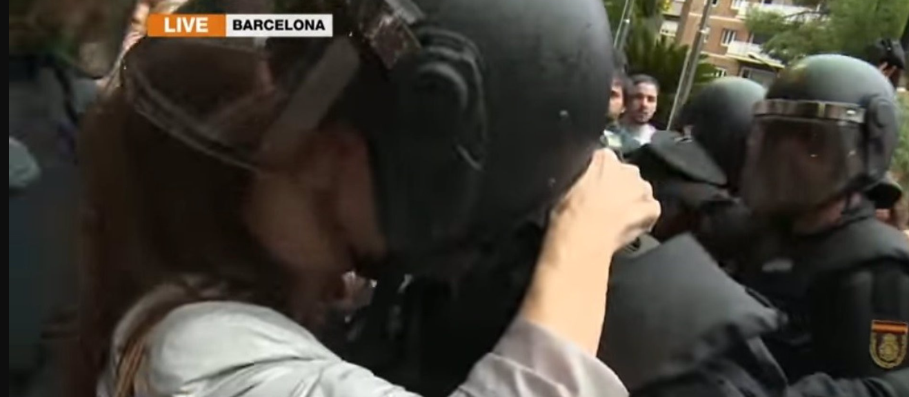Los hechos ocurrieron en la calle Vía Augusta frente a los Servicios Centrales del Departamento de Enseñanza, usado como colegio electoral, como se puede observar en un vídeo que se adjunta en la demanda que pide identificar a la manifestante que, en un momento determinado, besa al policía, aprovechando que tenía levantada la visera de protección de su casco.