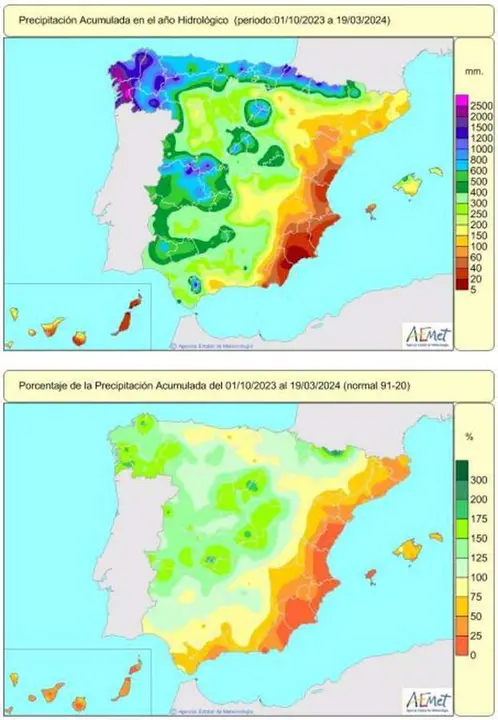 Las precipitaciones acumuladas en España desde el inicio del año hidrológico, el pasado 1 de octubre de 2023, hasta el 19 de marzo de 2024, se encuentran un 5% por encima del valor normal correspondiente a dicho periodo, según ha informado este viernes la Agencia Estatal de Meteorología (AEMET).