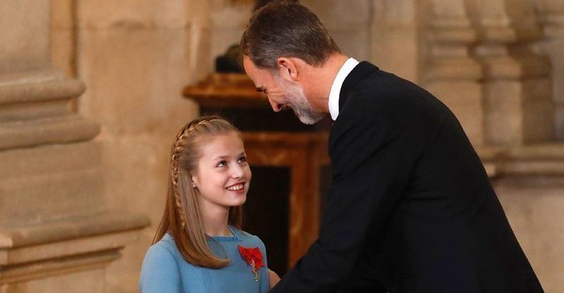La Princesa de Asturias sigue así los pasos de su padre. Al igual que este, pronunció sus primeras palabras en público con 13 años, aunque en el caso de Don Felipe fue durante la entrega de los Premios Príncipe de Asturias en 1981 y su hija lo hizo para leer el Artículo 1 de la Constitución en un acto organizado con motivo de su 40 aniversario.