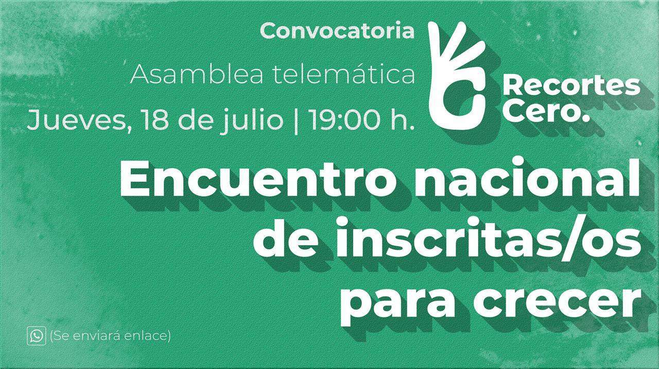 La Coordinadora Estatal de Recortes Cero se complace en anunciar la celebración de un Encuentro telemático que tendrá lugar el próximo jueves 18 de julio a las 19:00 horas. Este evento, abierto a todas las inscritas e inscritos de Recortes Cero, será una oportunidad para reflexionar sobre el presente y futuro de nuestra organización.