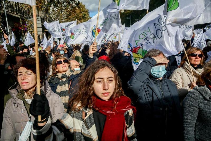 Varias personas en la concentración provida de este domingo en Madrid contra la ley de eutanasia y los ataques a la objeción de conciencia de los médicos al aborto