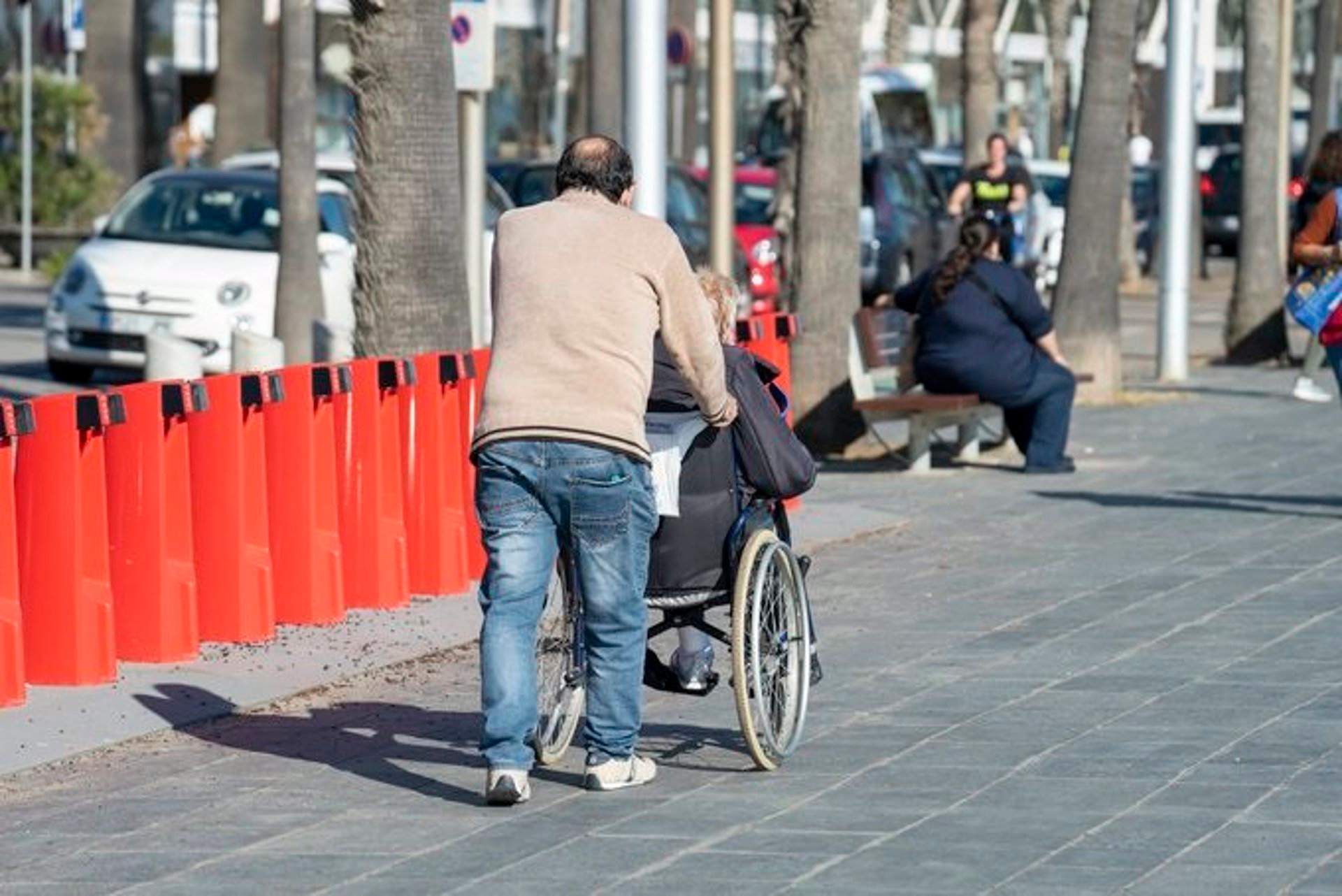 Una persona acompañando a otra en silla de ruedas