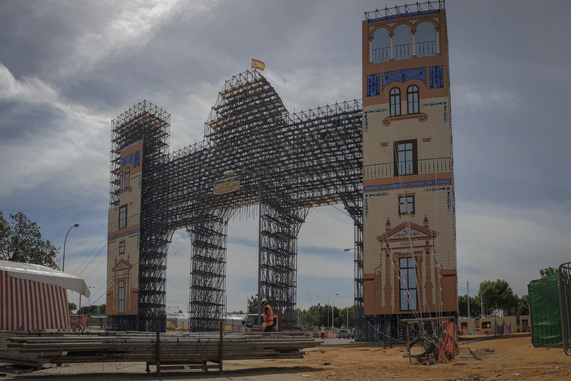 Archivo - Imagen de archivo de operarios trabajando en el desmontaje de la portada de la Feria de Abril de 2020, suspendida por la pandemia - María José López - Europa Press - Archivo