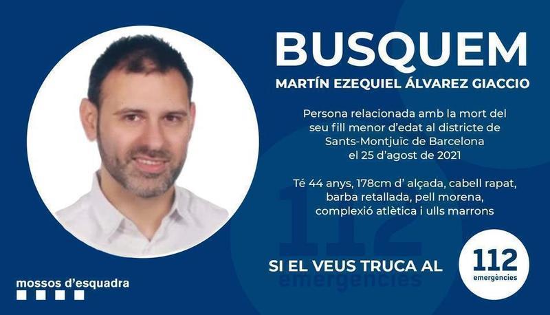 Los Mossos explican que el hombre tiene 44 años, mide 178 cm, lleva el pelo rapado, barba recortada, piel morena, complexión atlética y ojos marrones. Según los agentes, es «una persona relacionada con la muerte de su hijo menor de edad en el distrito de Sants-Montjuic». Los Mossos han pedido que cualquier persona con información llame al 112.