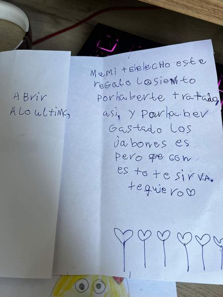 En ella se puede leer: "Mami te he hecho este regalo. Lo siento por haberte tratado así y por haber gastado los jabones. Espero que con esto te sirva. Te quiero". Un gesto por parte de los más pequeños que la plataforma ha aplaudido por lo valores que la madre le ha inculcado y por la que ha recibido más de 8.000 "me gusta".