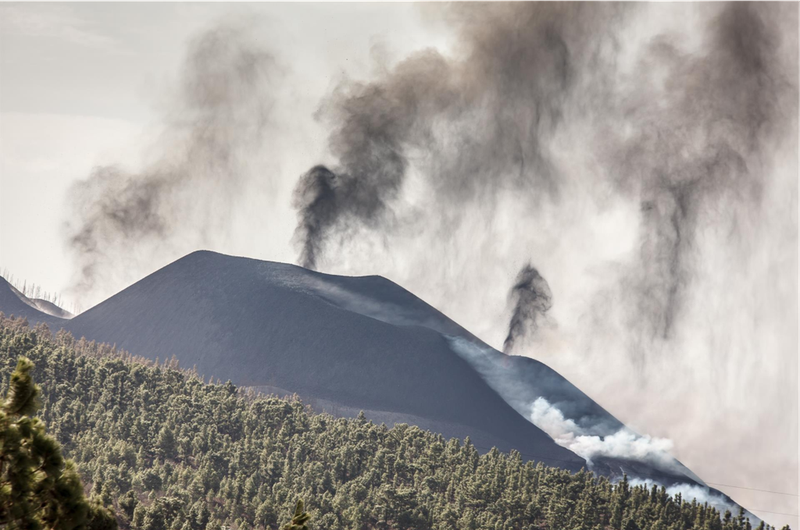 Vista del volcán de Cumbre Vieja con las tres nubes de ceniza, desde Los Llanos de Aridane - Europa Press