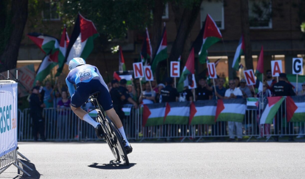El israelí Nadav Raisberg, en un momento de su participación en la contrarreloj de Valladolid con grupos pro Palestina condenando el genocidio en Palestina.- Photogenic/Claudia Alba - Europa Press