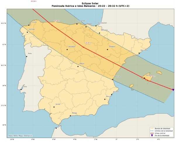 Este eclipse total se desplazará desde el norte hacia el área del Mediterráneo, afectando en particular al noreste peninsular durante las últimas horas del día. Sin embargo, la presencia habitual de condiciones atmosféricas variables en verano representa un obstáculo significativo para disfrutar de una visión clara del fenómeno en gran parte del recorrido.