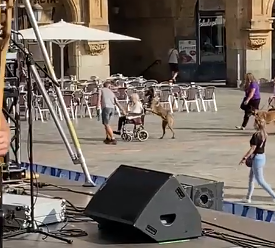 Un perro empuja la silla de ruedas de su dueña en una plaza de Salamanca
