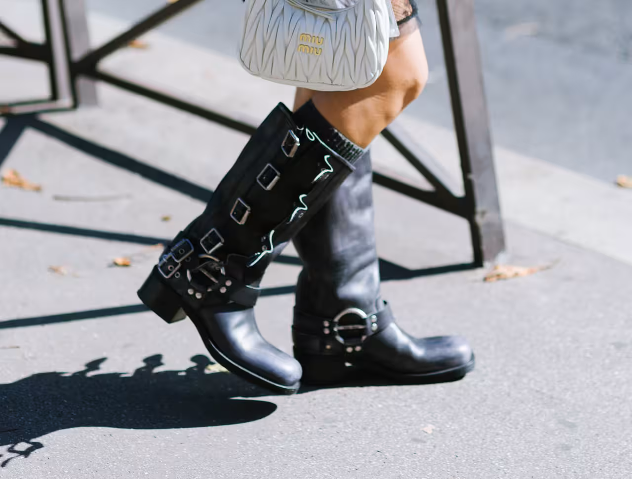 En paralelo, Hermès reafirmó el carácter atemporal de las botas de inspiración ecuestre, mientras Miu Miu insistía en la silueta afinada de la bota stretch o calcetín. Y, en medio de esta ola de revivals y diseños con vocación permanente, las botas biker volvieron a escena: el mismo pulso rebelde de siempre, pero con una lectura más sofisticada.
