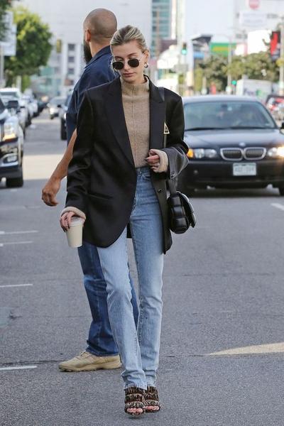 1. CON AMERICANA PARA LA OFICINA: Nos encanta como queda el resultado de combinar americana con pantalón recto. Hailey apuesta por llevar la americana del mismo color que los zapatos y tenemos que reconocer que queda espectacular.