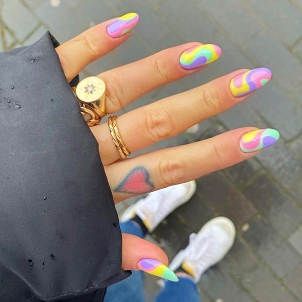 Otra tendencia relacionada con las líneas. Las curvas arrasan esta primavera y a diferencia de la anterior se ve genial tanto en las uñas cortas, como en las largas. Aquí predominan los colores de arcoíris, ya sea en su versión vibrante o, de nuevo, color pastel. 10/10.
