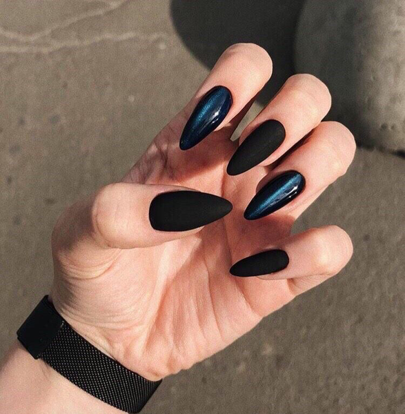 Lo dicho: otro extremo de las tendencias de primavera 2021. Pese a que la naturalidad en las uñas es una gran protagonista, las uñas punk en tonos petróleo, azul metalizado y negro son otra alternativa y va pisando muy fuerte. Generalmente viene con las uñas almendradas y largas, un mix perfecto para las más atrevidas. A estos colores se le suma el rojo casi negro, que revolucionó el mundo de los 90, que arrasa este 2021.