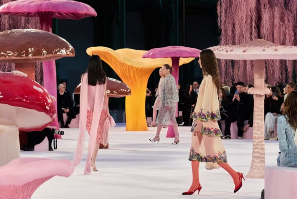 El Grand Palais se convirtió en un bosque de setas gigantes sobre una alfombra rosa pálido, con la banda sonora de La Bella Durmiente de Walt Disney al inicio y un cierre inesperado con “Wonderwall” de Oasis. Quien esperara vestidos de princesa se encontró con algo más contenido.
