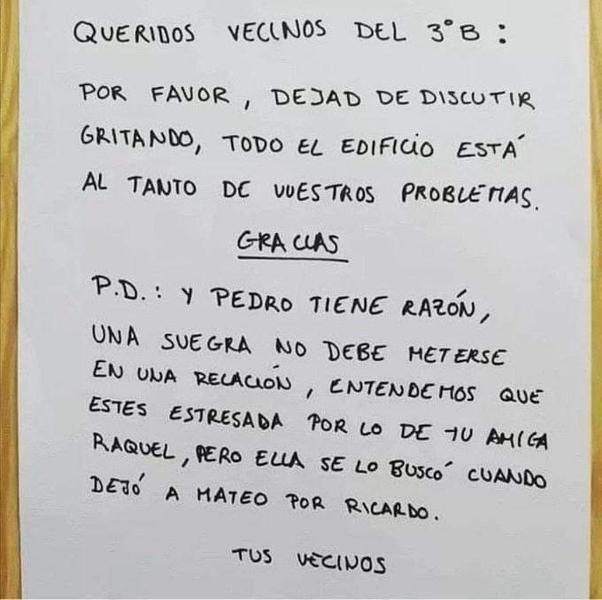 En la carta se solicita que estos vecinos dejen de discutir gritando, ya que el resto de residentes se entera de lo que les ocurre en su vida privada. Además, incluye una posdata que ha desatado la risa y el humor entre el resto de perfiles que han podido leer esta publicación: "P.D.: Pedro tiene razón, una suegra no debe meterse en una relación, entendemos que estés estresada por lo de tu amiga Raquel, pero ella se lo buscó cuando dejó a Mateo por Ricardo".