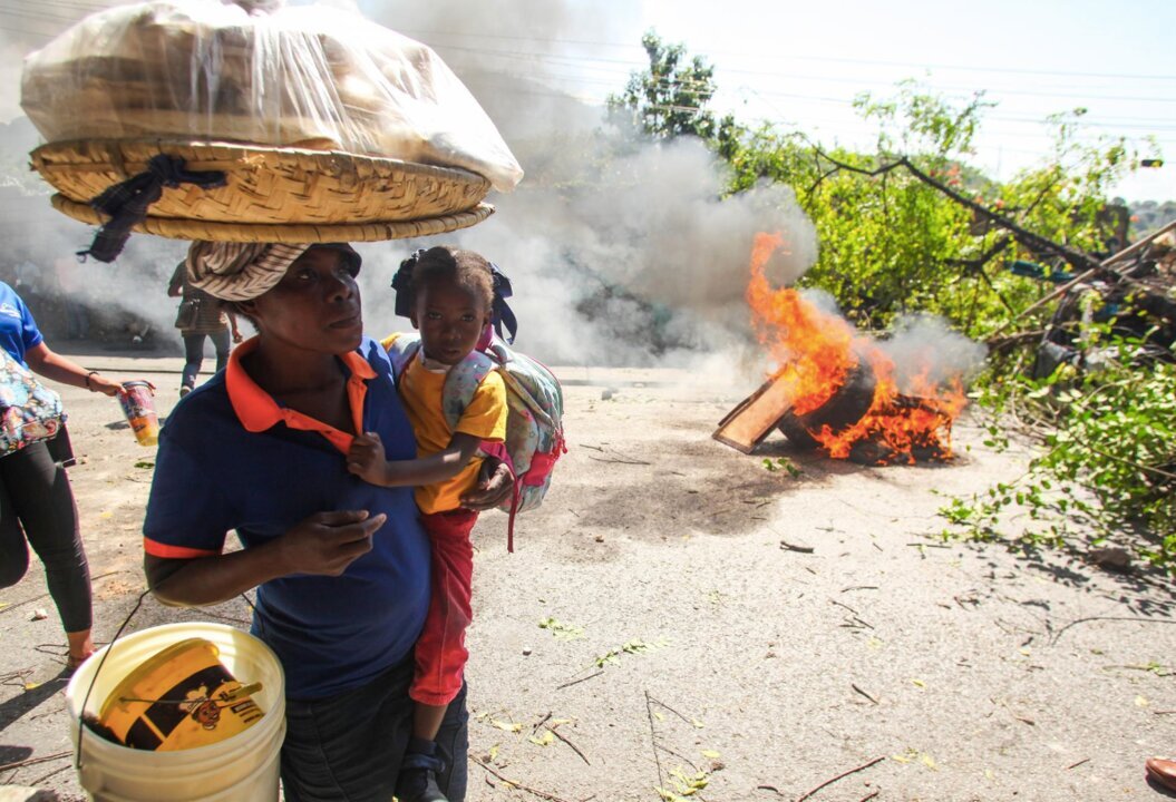 Una mujer con una niña pasan junto a una barricada en llamas, en Puerto Príncipe. - Patrice Noel/ZUMA Press Wire/dpa | EP
