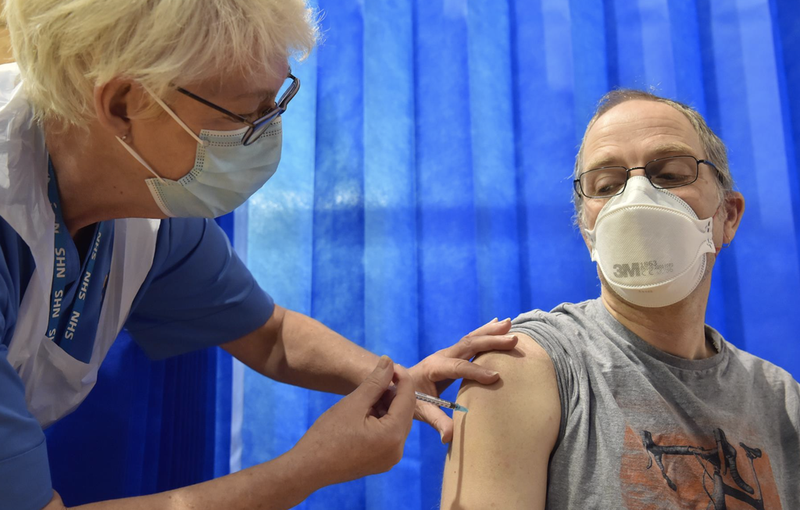 08 December 2020, Wales, Cardiff: David Farrell receives the Pfizer/BioNtech vaccine in a vaccination centre on the first day of the largest immunisation programme in the UK's history. Photo: Ben Birchall/PA Wire/dpa - Ben Birchall/PA Wire/dpa