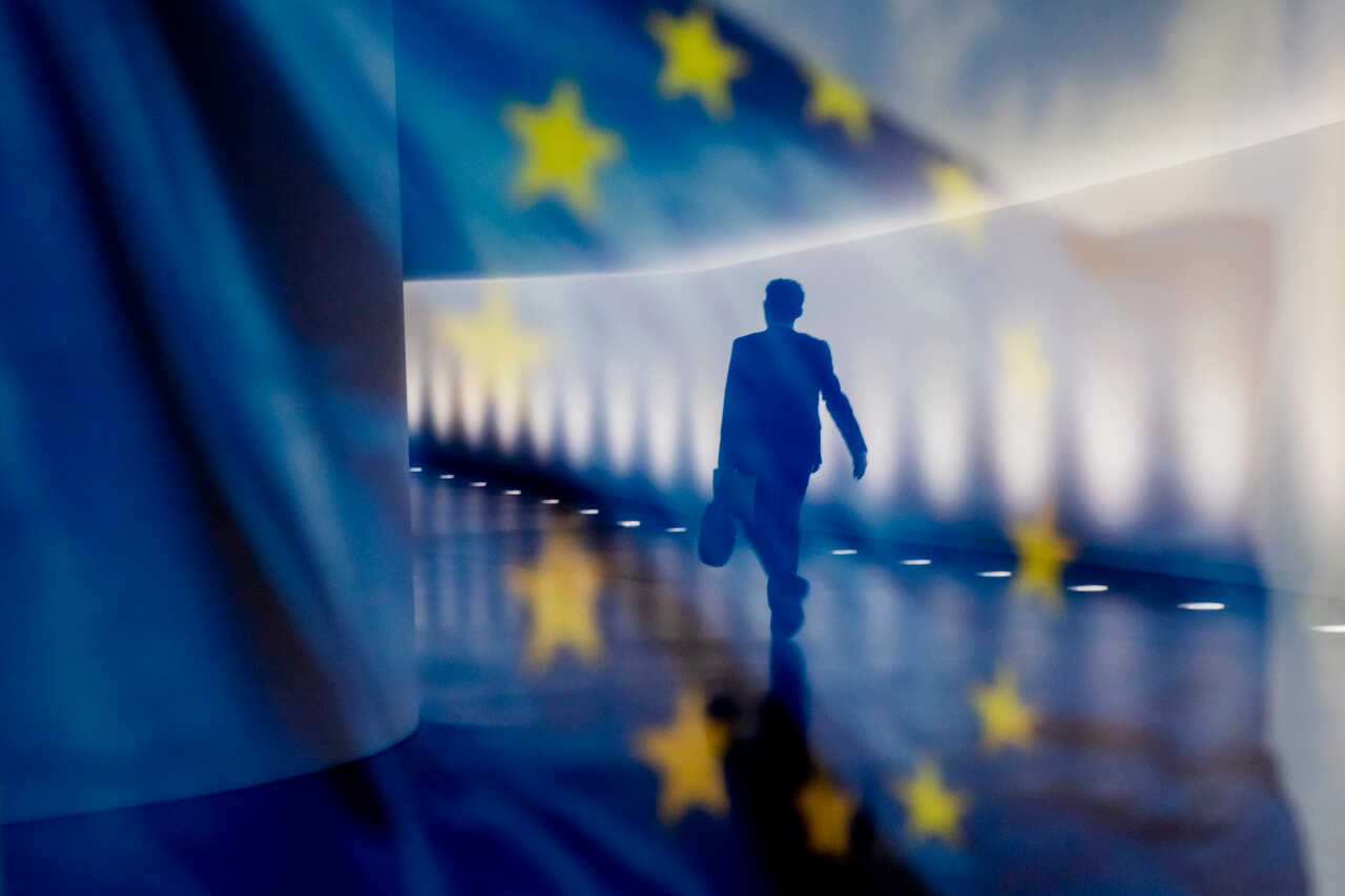 Archivo - Reflejo de una persona junto a una bandera de la Unión Europea (UE).