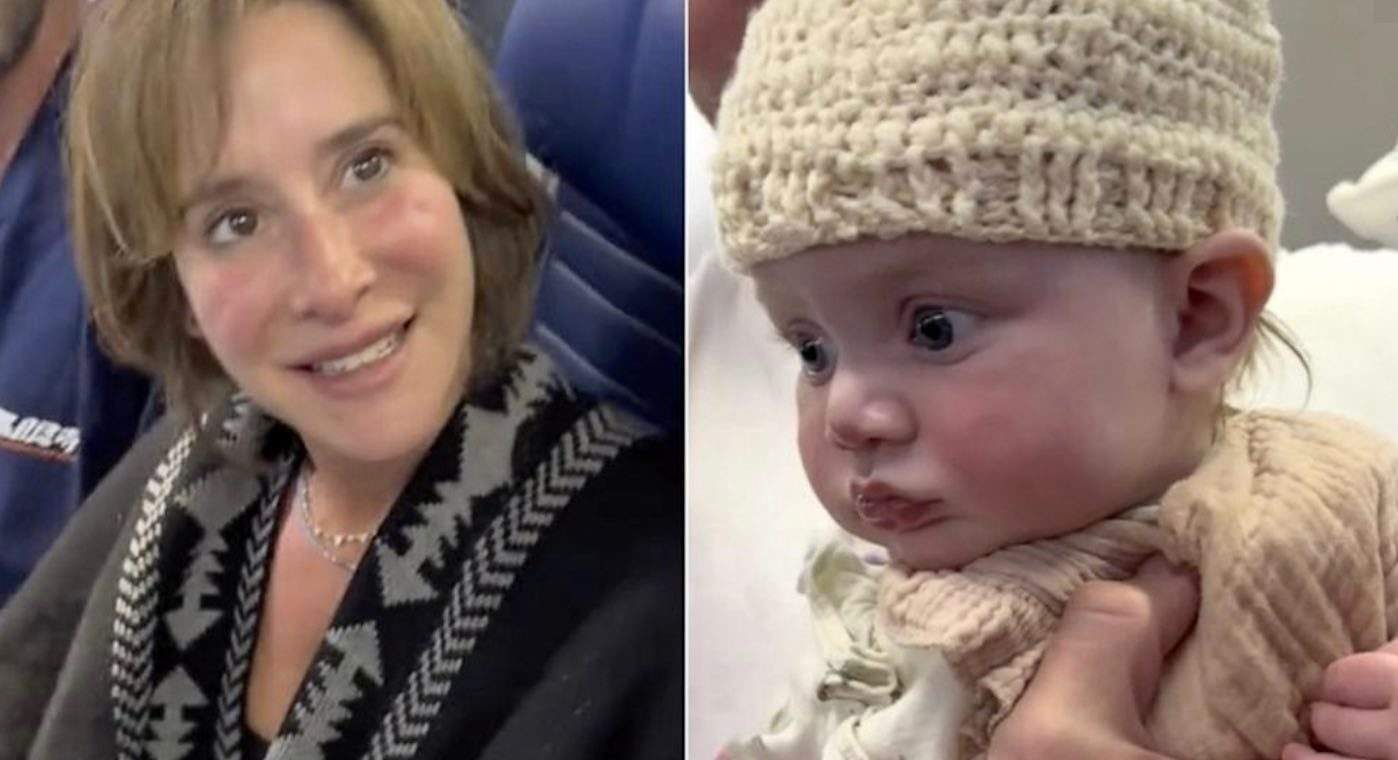 Un extraño en un avión teje un gorro para un bebé hipnotizado por el hilo
