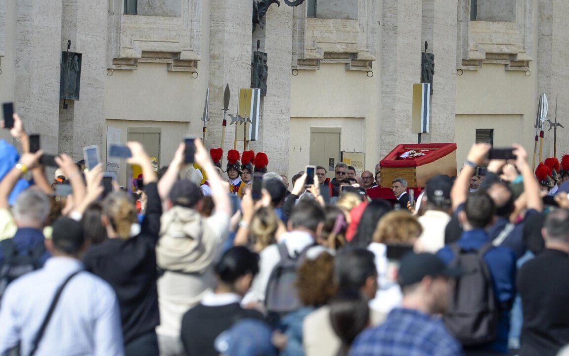 Se acercan al féretro, sacan sus teléfonos al llegar a la barrera y se detienen unos instantes a mirar al Papa Francisco mientras hacen la señal de la cruz.