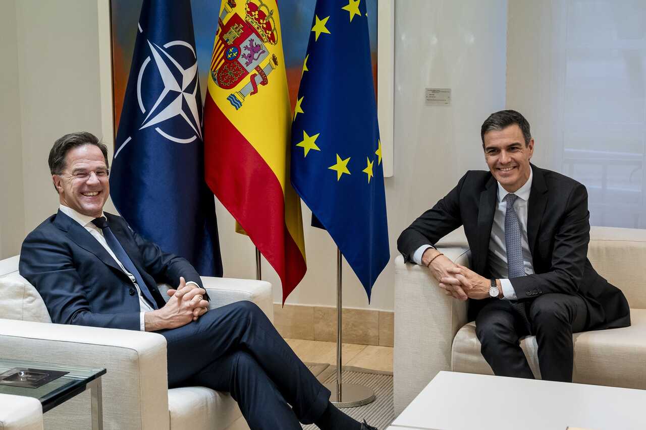 Archivo - El presidente del Gobierno, Pedro Sánchez (d), y el secretario general de la OTAN, Mark Rutte (i), durante una reunión, en el Complejo de la Moncloa, a 27 de enero de 2025, en Madrid (España).