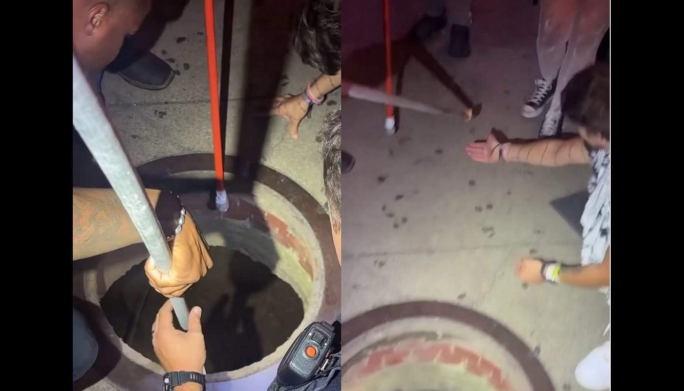 Un vídeo, publicado por la policía, muestra a uno de los agentes sacando lentamente del desagüe el poste de metal y el anillo adjunto.