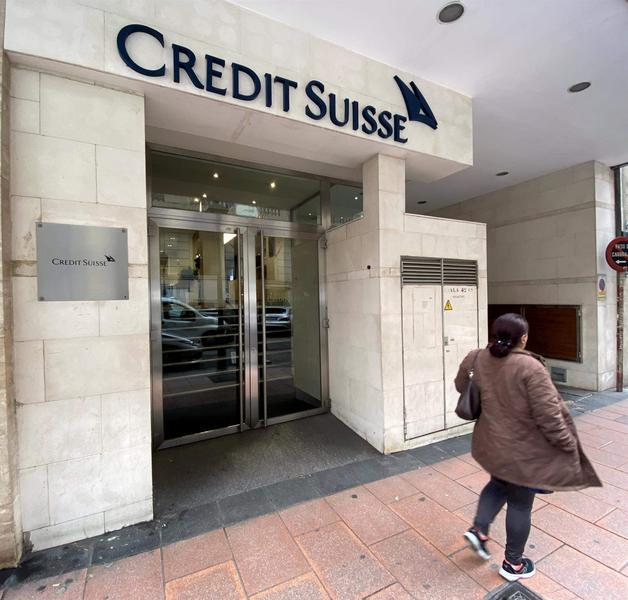 Una mujer pasa junto a la entrada de la sede de Credit Suisse en Madrid