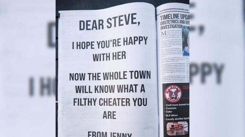 Una mujer australiana expone a su esposo infiel con un anuncio en el periódico local. La victima de la infidelidad, identificada como Jenny, decidió pagar una publicación en el periódico local Mackay and Whitsunday Life para dar a conocer en todo el pueblo la infidelidad de su pareja.