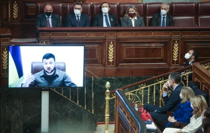 Durante su intervención ante el Pleno de la Cámara Baja, al que se ha dirigido de forma telemática, Zelenski ha celebrado que "muchas compañías españolas han parado de funcionar en Rusia" y ha querido "agradecer" el apoyo a estas compañías, al pueblo y a la sociedad.