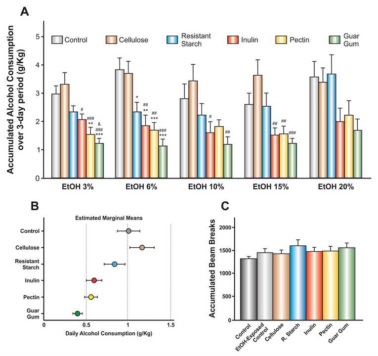 En concreto, el estudio evaluó seis dietas diferentes: una dieta estándar y cinco dietas enriquecidas con diversas fibras, como celulosa, pectina, almidón resistente, goma guar e inulina. Tras el periodo de intervención dietética, los animales tuvieron acceso libre al alcohol según un protocolo estandarizado de consumo.
