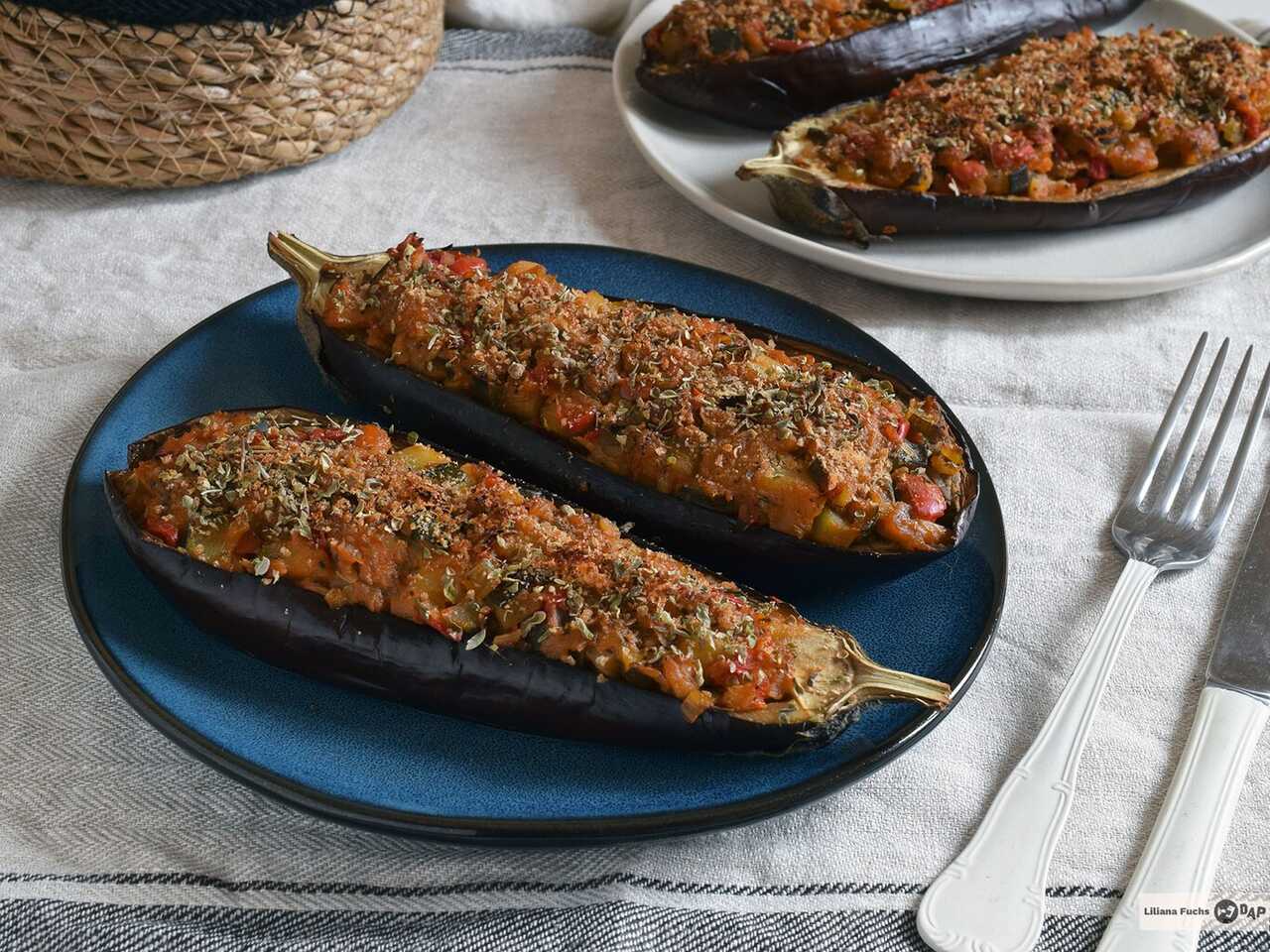 Rellenar las mitades de berenjena generosamente con esta mezcla y cubrir con levadura de cerveza y pan rallado, o bien utilizar queso rallado para gratinar. Finalmente, gratinar en el horno justo antes de servir.