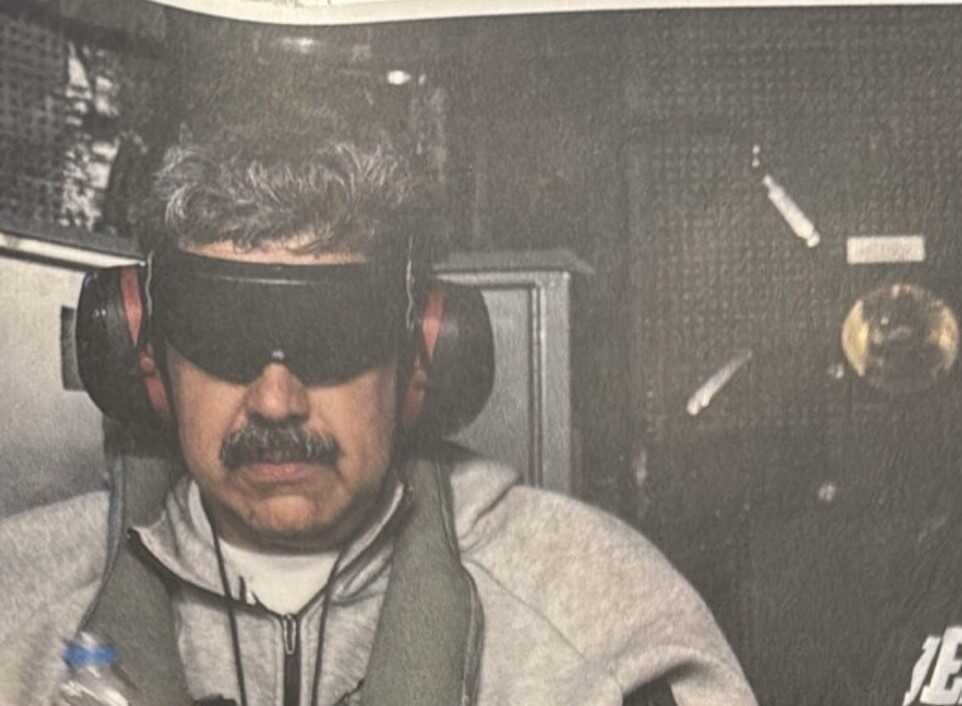 En la imagen, Maduro aparece maniatado, con auriculares y un dispositivo que le bloquea la visión. También sostiene una botella pequeña de agua mineral y permanece de pie junto a una persona cuyo uniforme muestra las siglas de la Agencia Antidroga de Estados Unidos, la DEA.