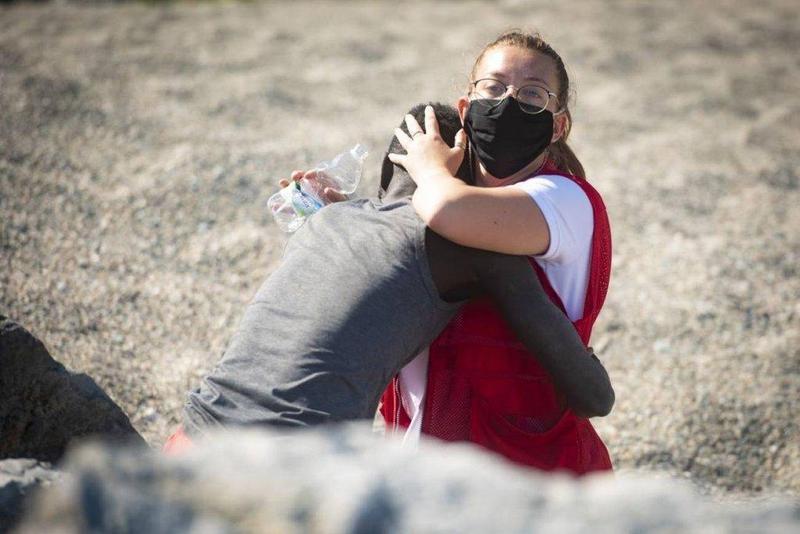 El abrazo entre una voluntaria de Cruz Roja y un joven inmigrante que llega a nado a Ceuta