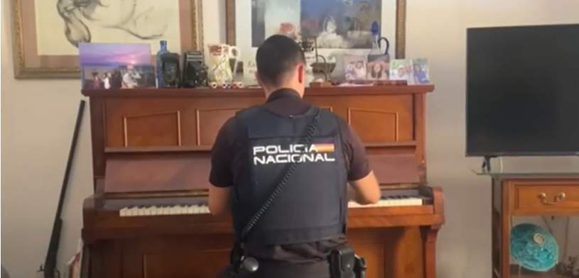 Un agente de la Policía Nacional calma a una anciana tras un robo tocando el piano