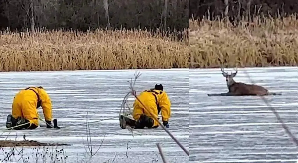 "Estaba luchando por salir del hielo delgado. Los bomberos se pusieron su equipo de protección y cruzaron cuidadosamente el hielo gateando. Lograron con éxito empujar al ciervo hacia la orilla".