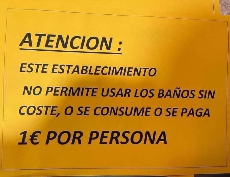 “Atención. Este establecimiento no permite usar los baños sin coste, o se consume o se paga 1 euro por persona”, se puede leer en un cartel bien grande de letras negras sobre fondo amarillo. “Debatamos sobre este cartel ¿A favor o en contra?”, escribe @SoyCamarero, abriendo el debate en redes de cientos de usuarios que han dado su opinión de la polémica iniciativa.