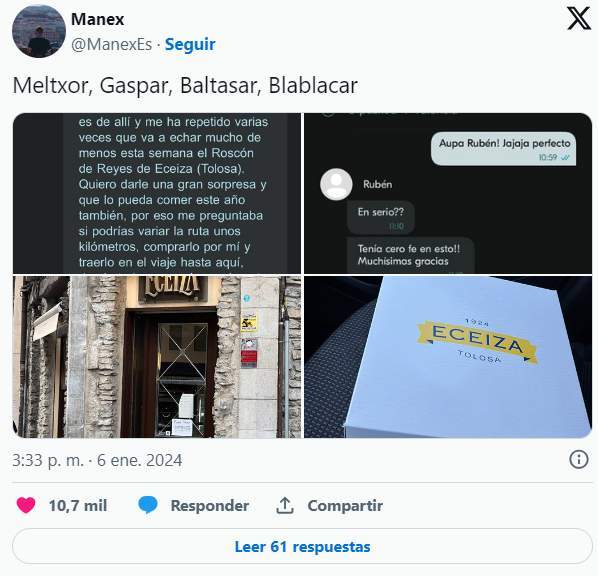 En la publicación con más de 603.000 visualizaciones, además de imágenes de la conversación, se puede ver una foto de la pastelería donde se hizo el roscón y una donde el mismo ya se encontraba en el coche de camino a su destino. "Melchor, Gaspar, Baltasar y Blablacar", ha bromeado en su perfil el conductor.