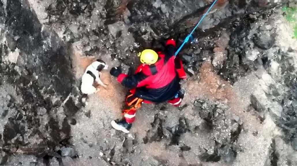 La cola de un perro varado no paraba de moverse de alegría cuando los bomberos llegaron a su peligrosa percha y lo rescataron de un acantilado escarpado