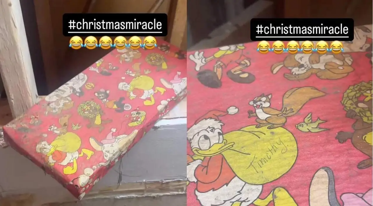 El paquete, cubierto con papel vintage de Disney, estaba destinado a ser colocado en una media navideña o bajo el árbol, pero quedó olvidado detrás de la pared durante décadas.
