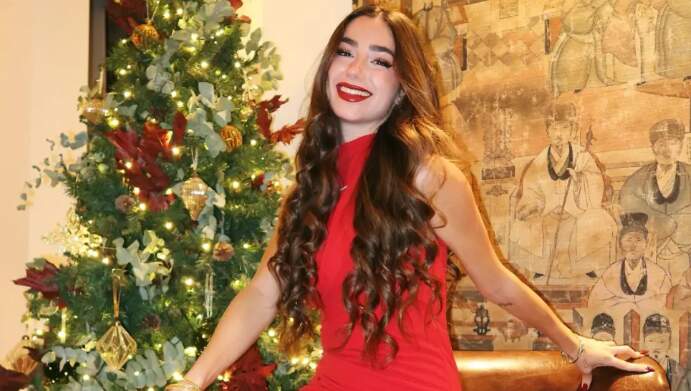 La influencer deslumbró con un look navideño cargado de referencias al glamour de las showgirls de Las Vegas y artistas legendarias como Cher. Para el evento, optó por un vestido de transparencias en rojo vibrante, con una falda mini decorada con flecos y pedrería incrustada, complementado con un escote halter. El toque retro y festivo se intensificó con una boa de plumas a juego y un corsé blanco que equilibraba la textura translúcida del conjunto. Para cerrar el estilismo, eligió unos zapatos de tacón en punta de color rosa, añadiendo un matiz moderno y femenino.