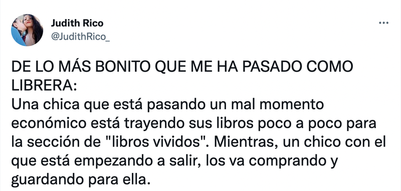 Judith Rico, una usuaria de Twitter, consiguió un éxito alucinante en redes sociales tras compartir un mensaje donde relata “lo más bonito” que le ha pasado desde que trabaja como librera. Los acontecimientos relatados incluyen a dos clientes: una chica que “está pasando un mal momento económico” y un chico que está empezando a salir con dicha chica.