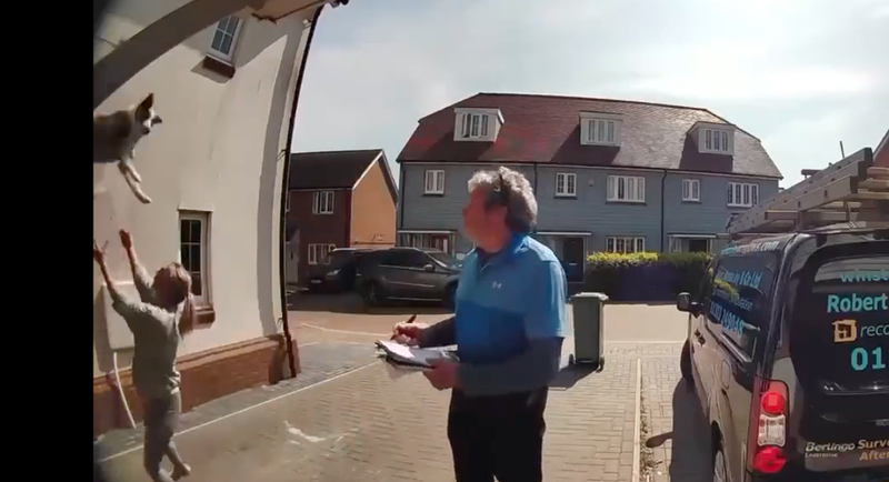 Una mujer consigue atrapar a su perro al vuelo mientras caía por la ventana del primer piso. Los hechos ocurrieron cuando la mujer bajó a la entrada del edificio a recibir a un repartidor, mientras estaba completando un formulario vio cómo su perro se precipitaba de la ventana y gritó “Oh, oh, oh vuelve, Clarence” mirando a su mascota que cayó al momento.