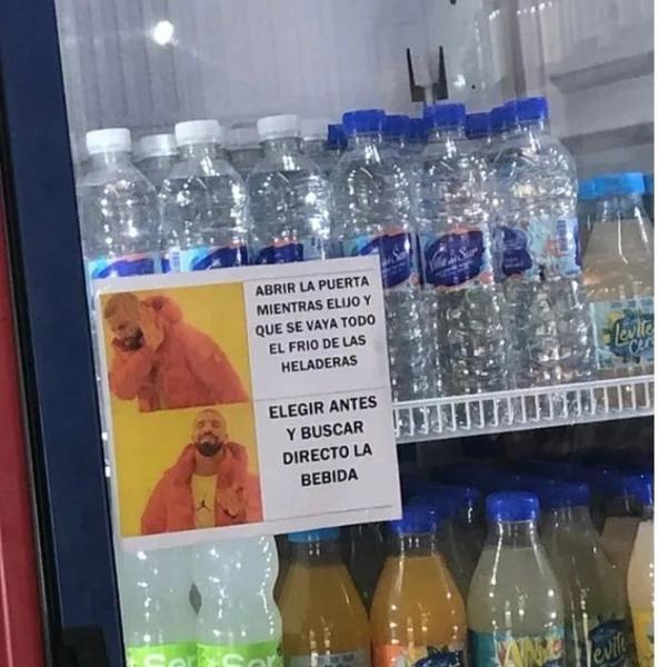 Las dos imágenes del rapero Drake son las protagonistas de este divertido cartel meme, negando una conducta primero y afirmando otra: "Abrir la puerta mientras elijo y que se vaya todo el frío de las heladeras" dice la primera de las viñetas con Drake desaprobando tal mala actitud, y aprobando el "Elegir antes y buscar directo la bebida".