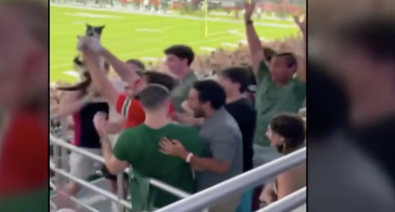 Un gato quedó enganchado en una lona del estadio en Miami Hurricanes y el Appalachian State, de la liga universitaria de fútbol americano.
