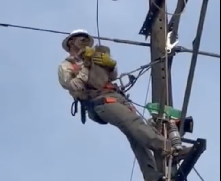 El animal estaba suspendido de un cable de alta tensión y se temía por su vida, así que un técnico municipal, Víctor Hugo López, se armó de valentía y se lanzó al rescate.