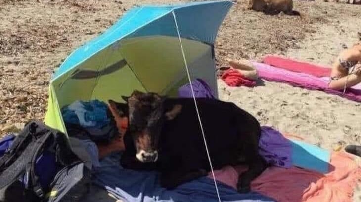 Cuando el sol pega fuerte todos necesitamos descansar un ratito a la sombra, !incluido las vacas¡. Así ha pasado en Cádiz, en la playa de Bolonia, donde una vaca ha ido a tumbarse bajo la sombrilla de una persona que estaba bañándose.