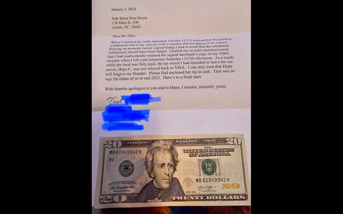 "Estamos encantados con esta carta, ¡es un hermoso ejemplo de cómo hacer lo correcto!" escribió el restaurante en Facebook después de que Ted enviara un billete de $20 para corregir su error y asegurar que la reputación y las ganancias de Hope fueran rectificadas.