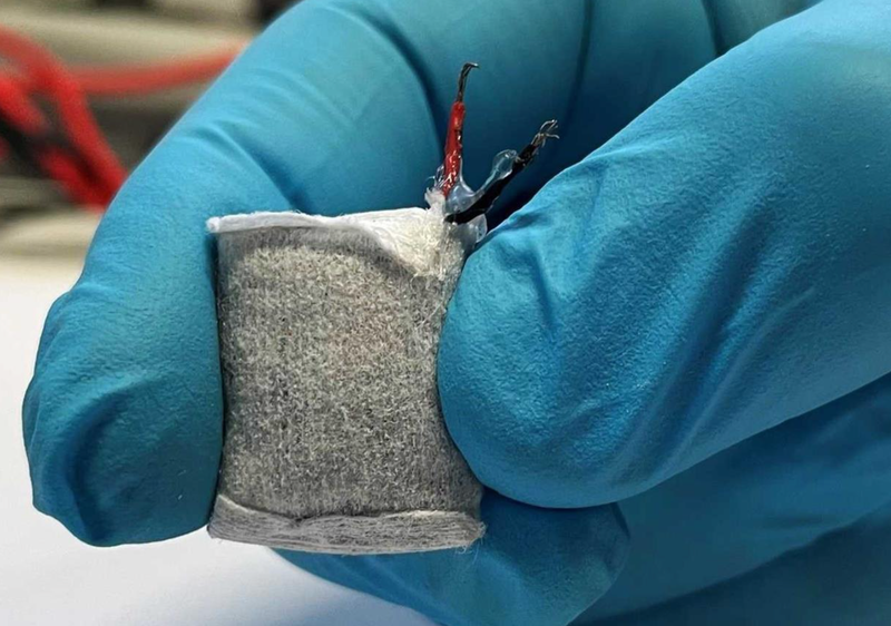 El prototipo de pila de combustible está envuelto en un vellón y es ligeramente más grande que la uña de un pulgar. - FUSSENEGGER LAB / ETH ZURICH